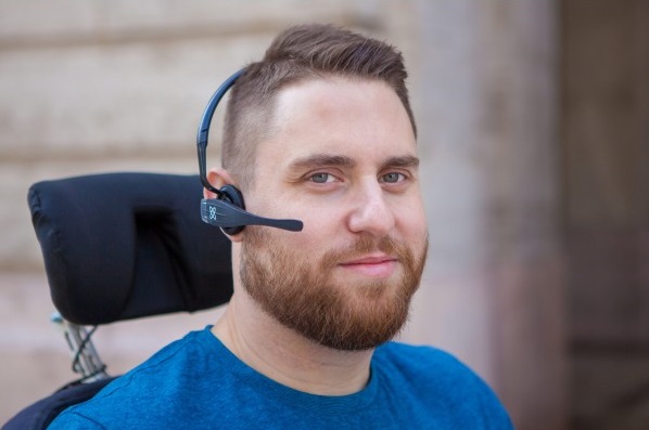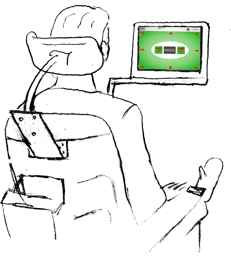 kabellosen Kopfbügel. Lediglich durch Kopfbewegung fährt der Rollstuhl